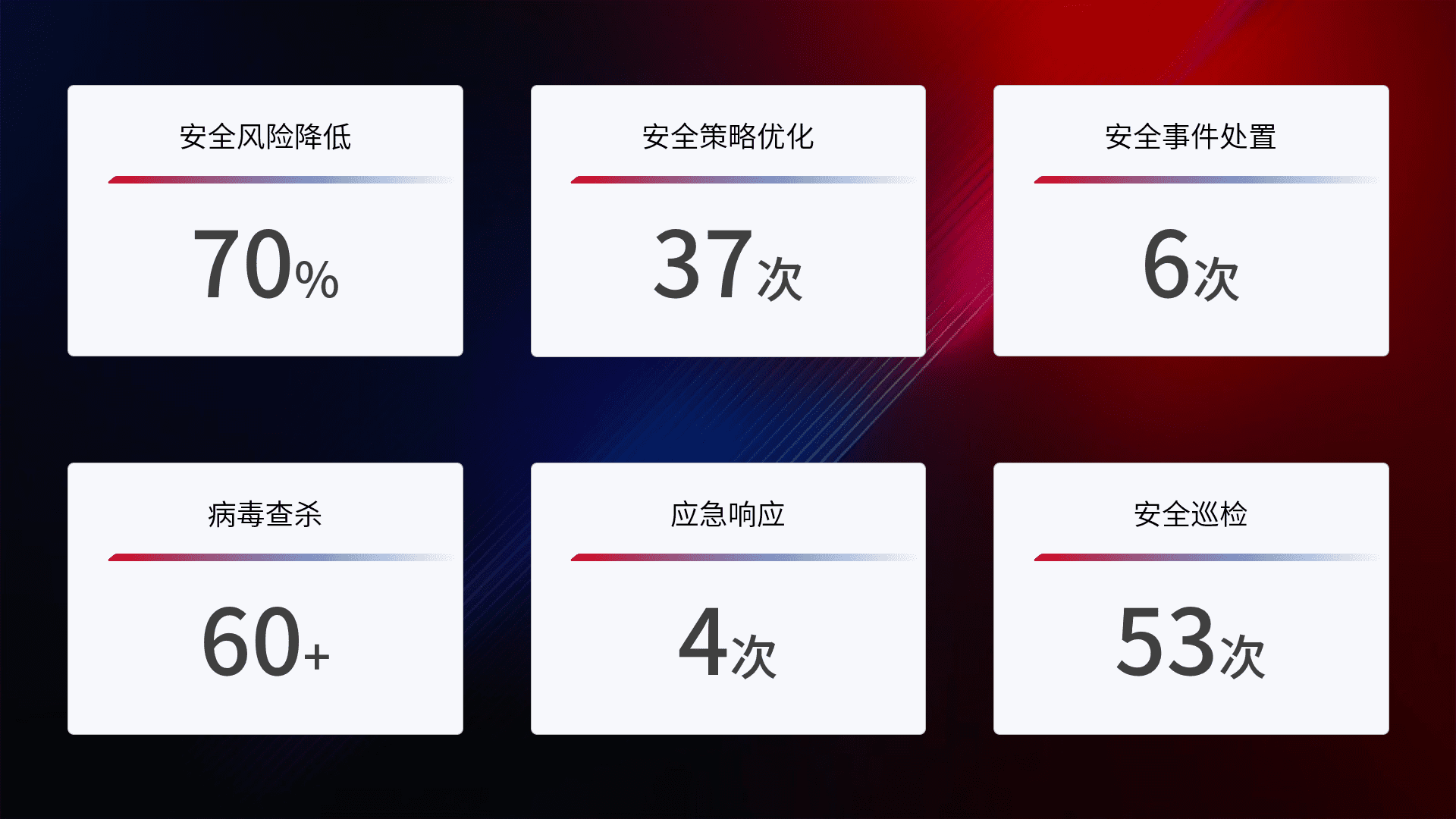 提供全面的安全事件报告体系,,,包括处置报告、、、周报、、、、季度和年度总结,,结合持续监控,,帮助客户深入了解网络安全状况。。