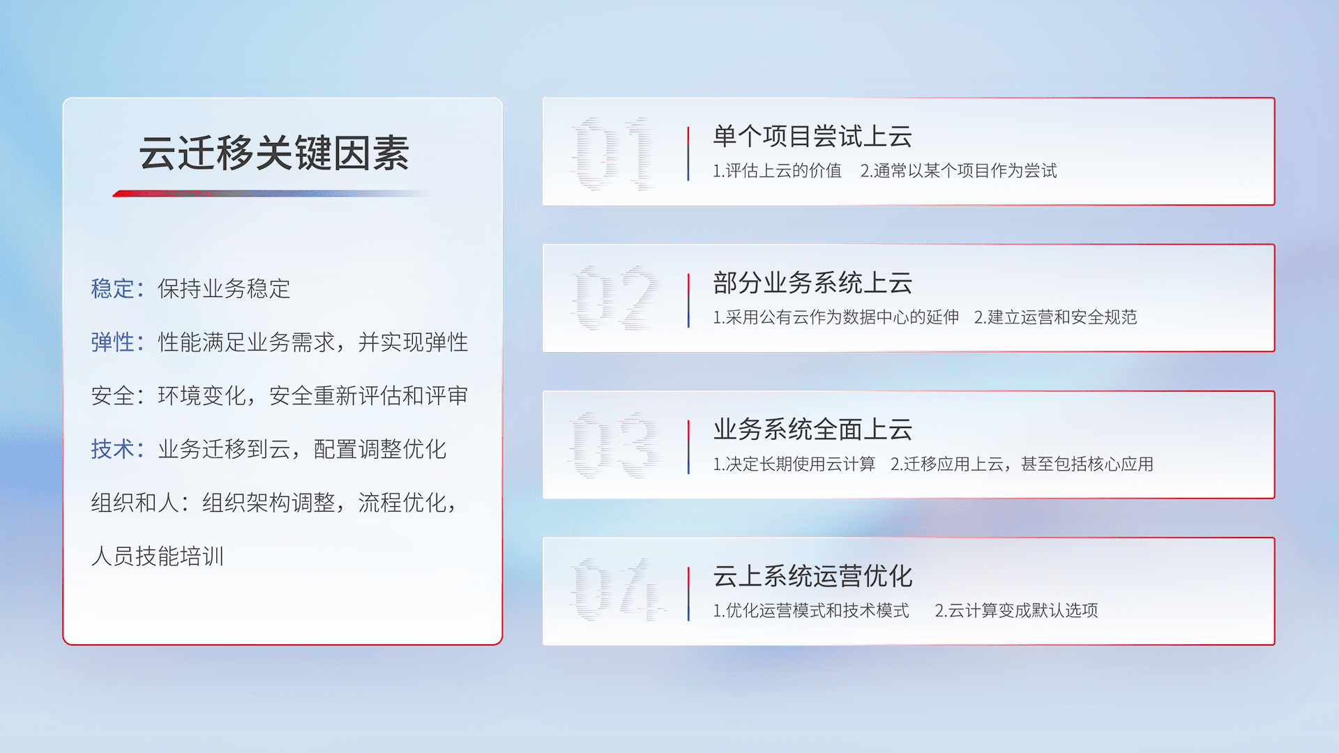 结合实际业务,,从规划设计、、云平台选型、、、、云原生改造、、、数据迁移、、集成交付,,迁移全过程为客户识别最佳上云路径,,,,做好风险识别管理,,设计网络架构、、、身份权限、、安全审计合规、、操作审计、、日志审计、、、、监控告警策略、、、多站点容灾设计等,,对云上基础设施进行整体规划,,提升IT治理水平,,,以满足弹性、、高可用、、、、高性能的需求。。。
