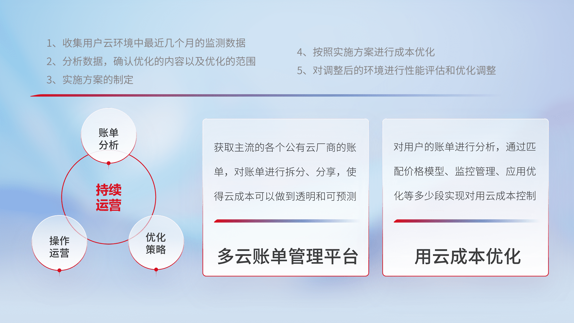 通过多云纳管,,,,以统一的资源数据模型把客户的云资源进行抽象和封装,,,进而实现对多云资源的统一操作,,,保障云资源管理的可靠性、、、、稳定性与可用性。。量身定制化运维内容,,,配置、、开发运维、、补丁管理、、、、备份、、、、监控、、认证和访问管理、、审计和日常巡检等,,,,保障在用云过程中的可靠度,,,,稳定度以及高可用率。。